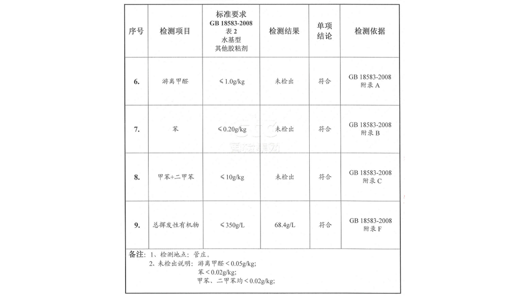 由于PVC塑膠地板廣泛使用在醫(yī)院、學(xué)校、幼兒園、養(yǎng)老院等人群聚集、氣味敏感、環(huán)保性要求“苛刻”的場所,因此目前對膠水的環(huán)保檢測也是異常嚴(yán)格,主要內(nèi)容包括甲醛、苯、甲苯+二甲苯、TVOC。