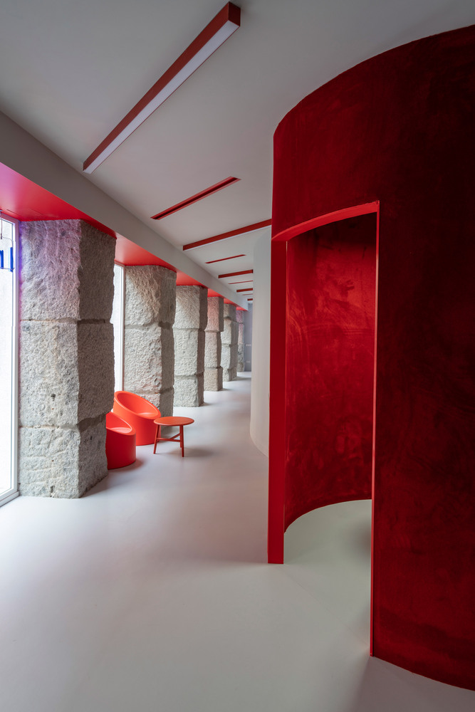 通過花崗巖外立面向內望去,內部精致鮮艷的圓形隔斷間與外部灰色的方形石材形成鮮明對比。