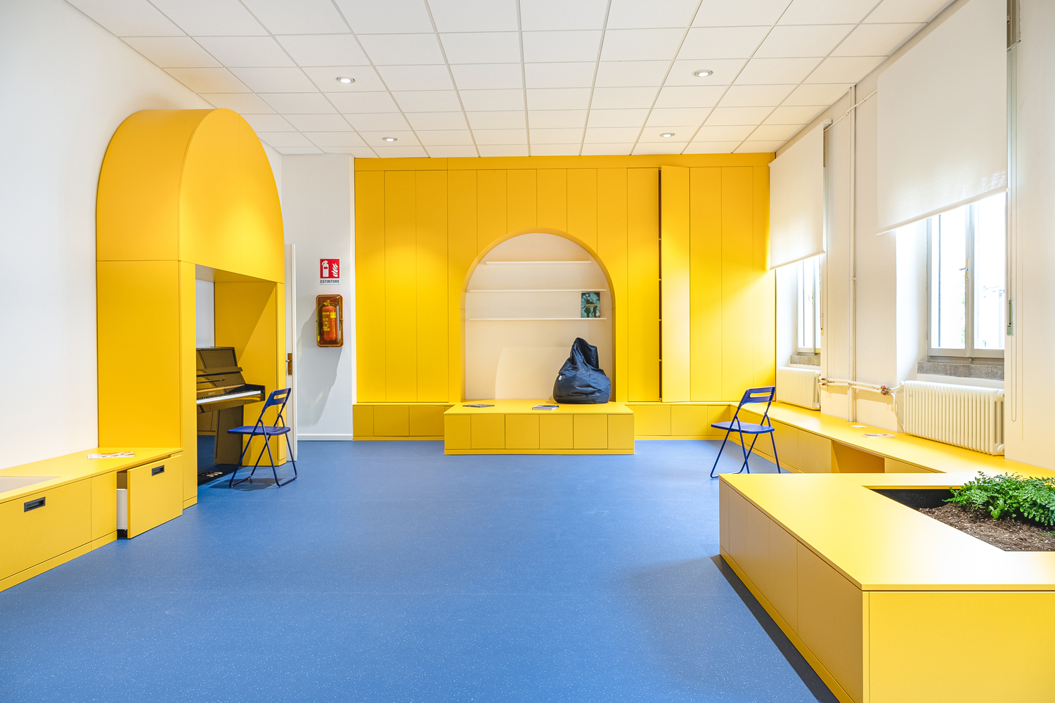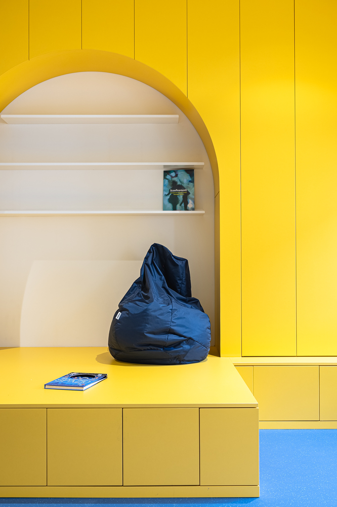 柜體整體使用明黃色的裝飾貼膜,地面則選用了海藍(lán)色的塑膠地板。整個(gè)空間充滿了創(chuàng)意與想象空間。